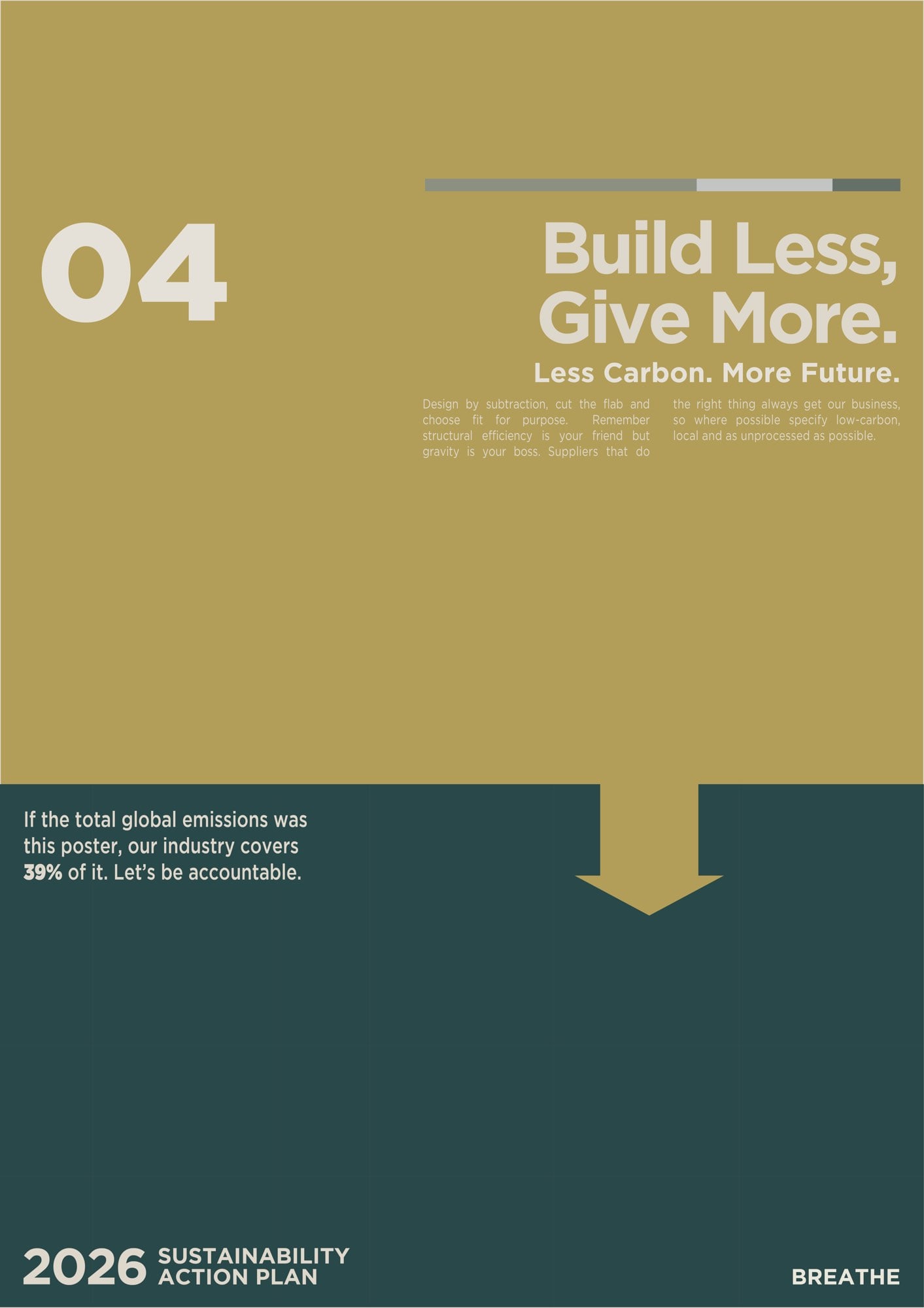 Every Breathe project, regardless of scale or type, must have a Life Cycle Assessment completed at concept design stage. Once measured, interrogate it. Seek a second opinion. Interpret it. Then use it as a tool to do better. To use less. Then, measure again.