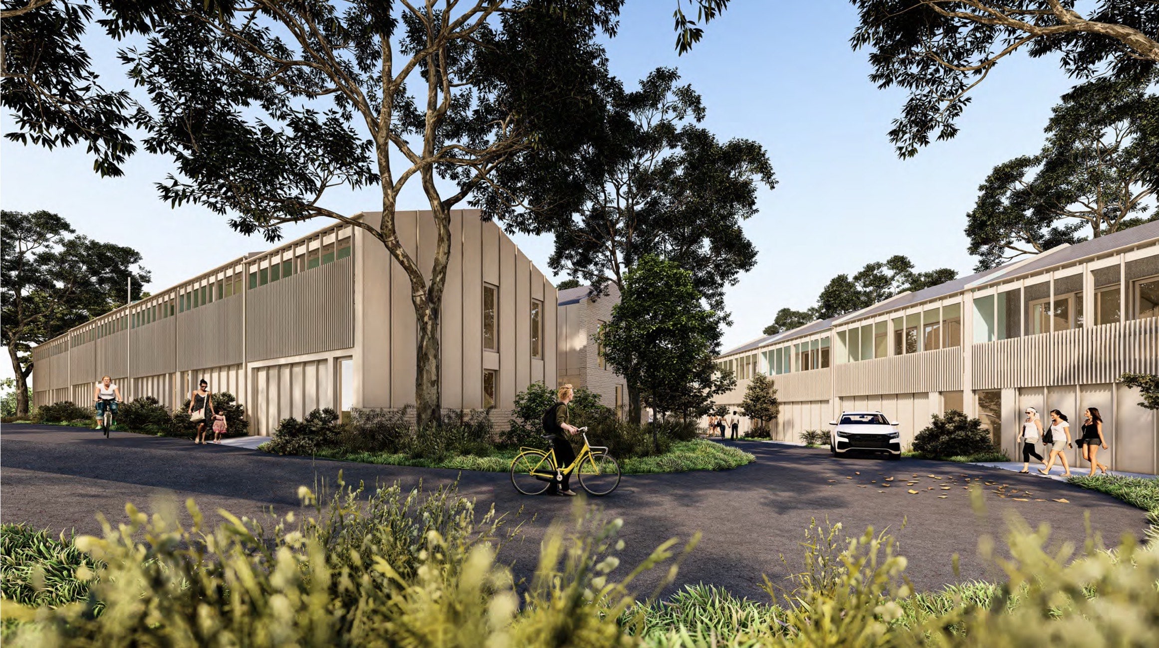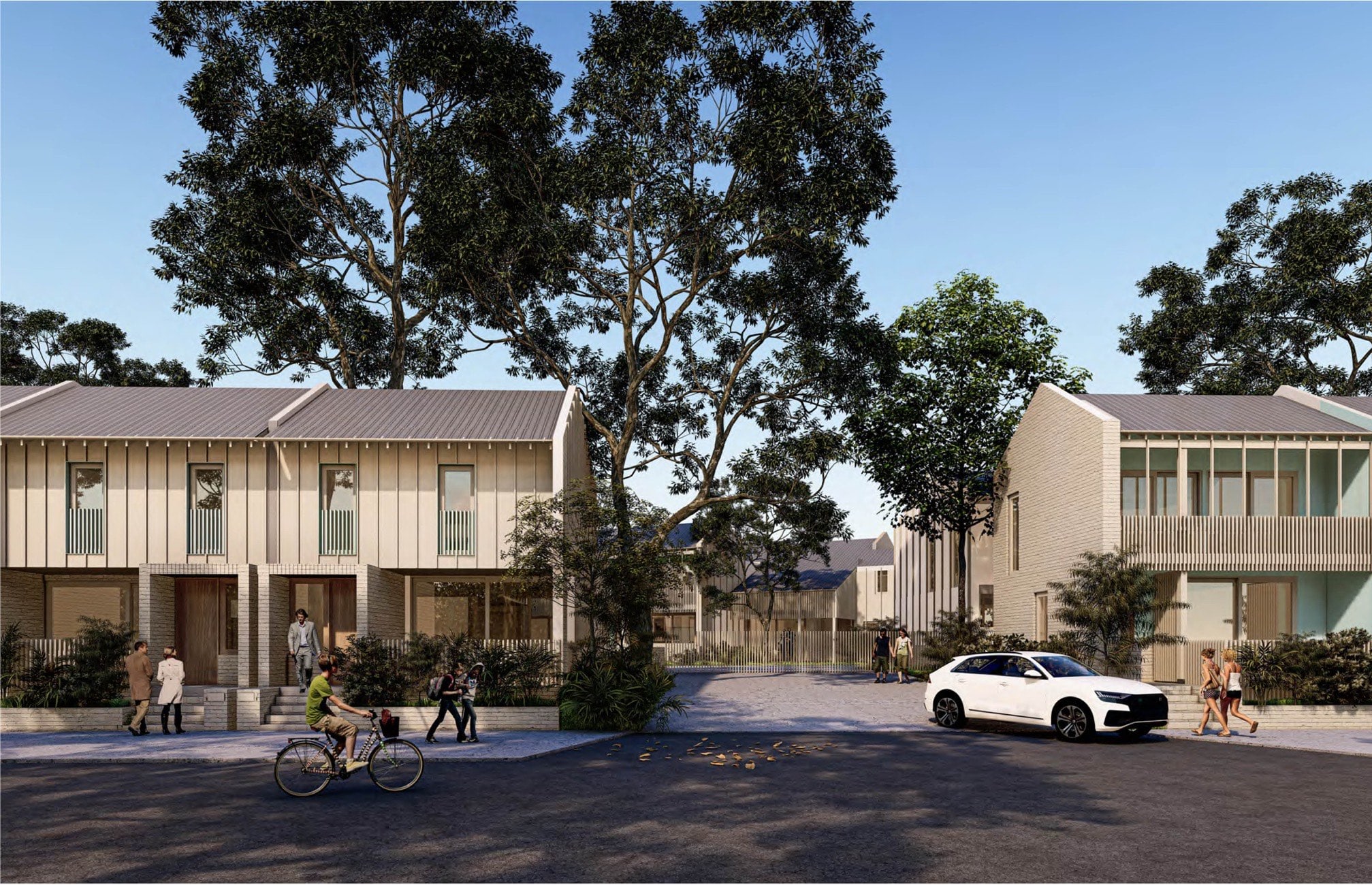 Located adjacent to a busy road, the development reorientates away from the road and creates a generous central park. A shared heart where neighbours gather, children play, a footy is kicked, and friends and family come together for barbecues. This green space also acts as a natural heat sink, absorbing carbon, cooling the air, and providing relief to the surrounding homes.